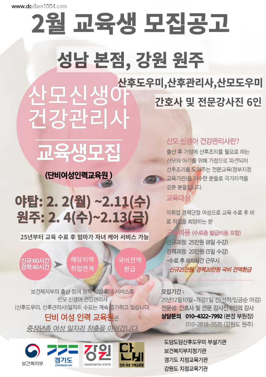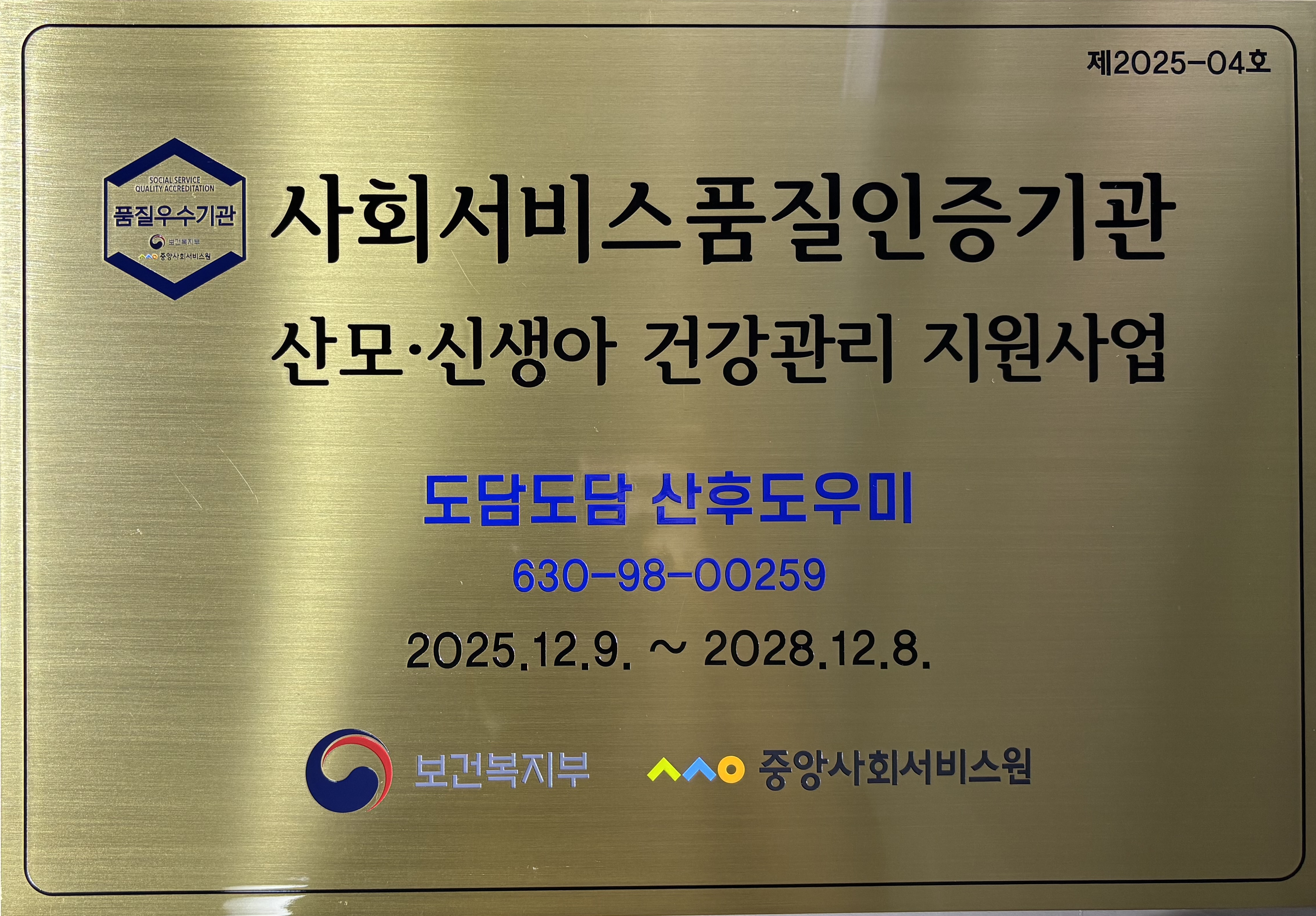 1. 도담도담 산후도우미(본사) 보건복지부 사회서비스 품질인증 획득 (전국 1,342개 기관 중 9개 기관만 선정, 2025. 12)