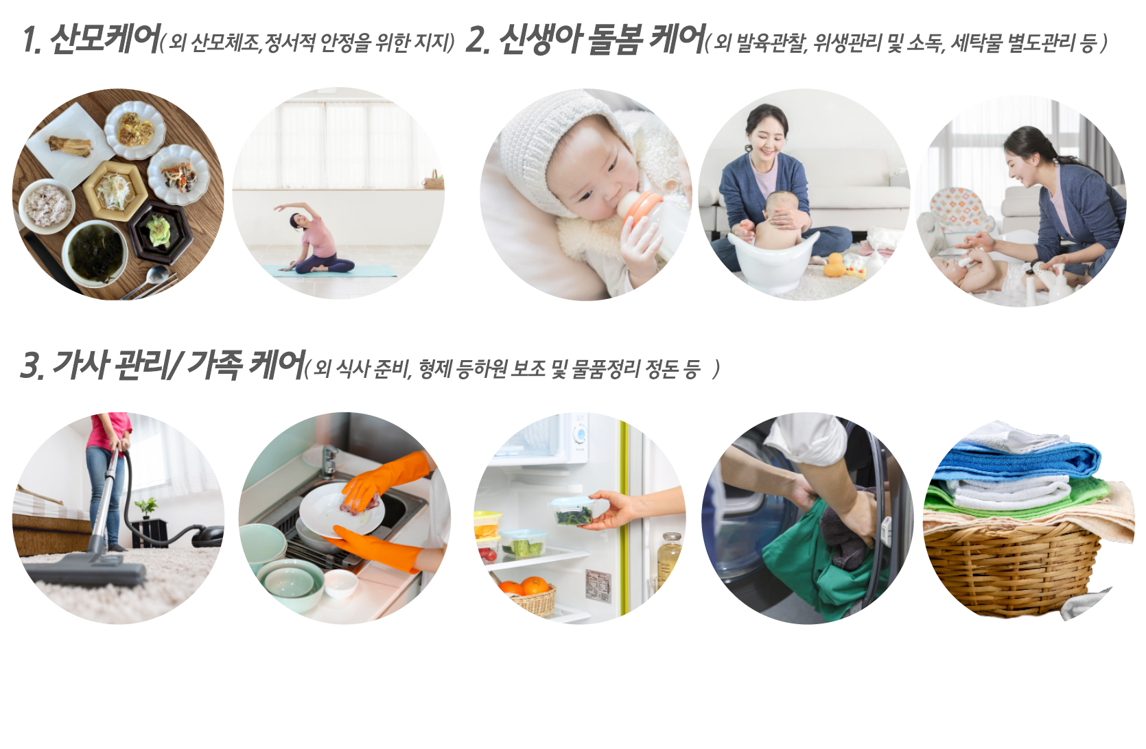 · 공통: 신체 상태 및 건강 상태 체크, 위생관리, 주 생활공간 청소, 산모 신생아 의류구분 세탁