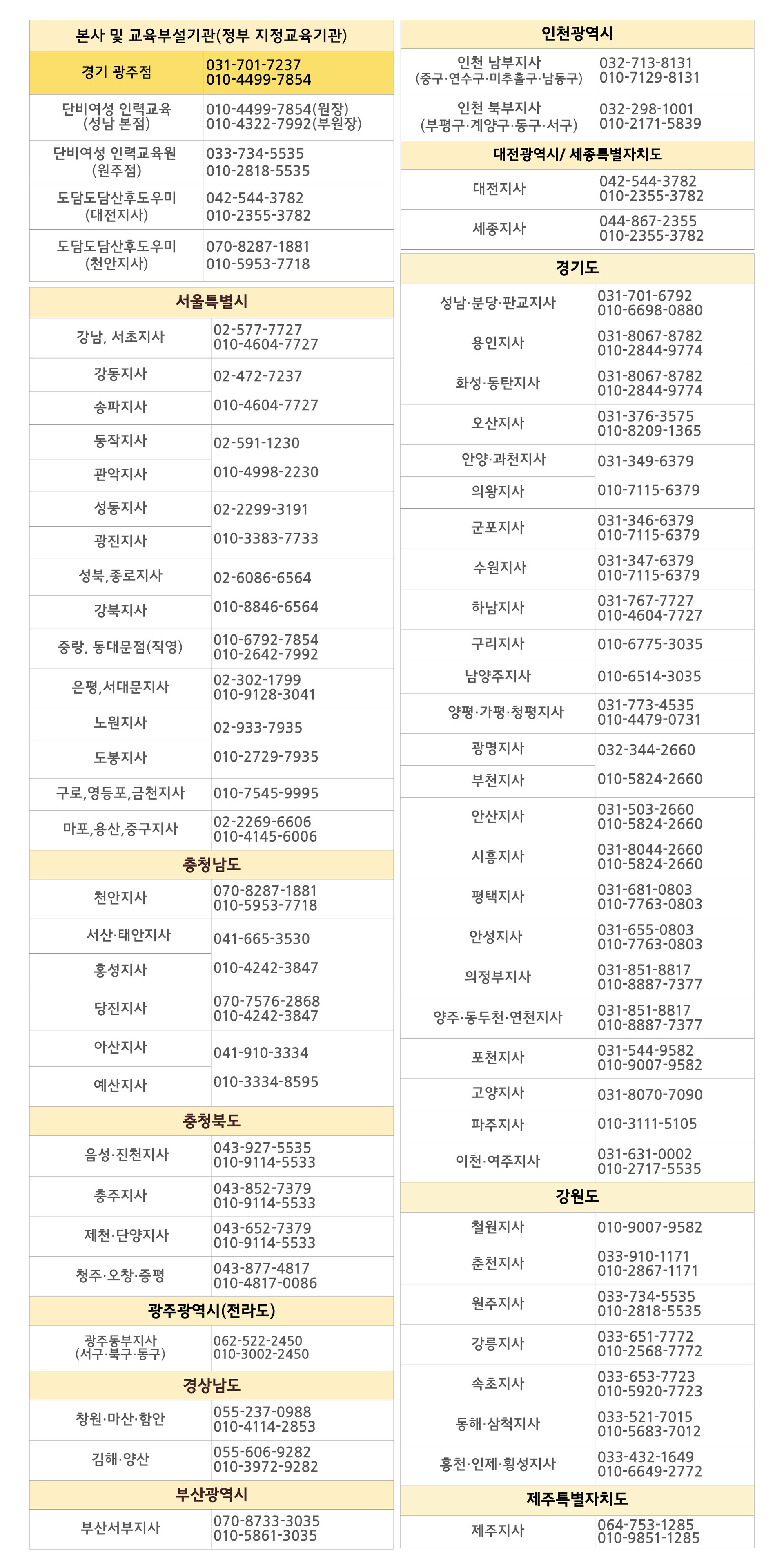 제공기관 연락처: 각 지사